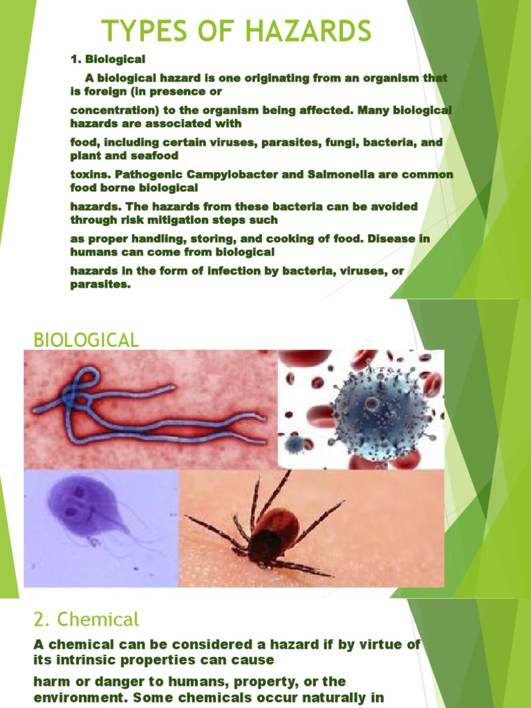 Biological hazards chemical hazards physical hazards • characteristics of certain microorganisms.